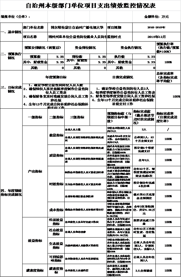 2018年公岗补贴项目绩效自评综述:根据年初设定的绩效目标,公岗补贴项目绩效自评得分为94分。项目全年年初预算数为0万元,调整预算数5.35万元,执行数为5.35万元,完成预算的100%。