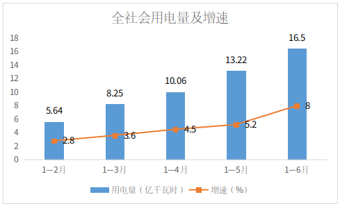 截至6月底,博州全社会用电量(电网同期监测数据,不含兵团,下同)16.5亿千瓦时,同比增长8%,自2月至5月,各月累计增幅分别为2.8%、3.6%、4.5%和5.2%。