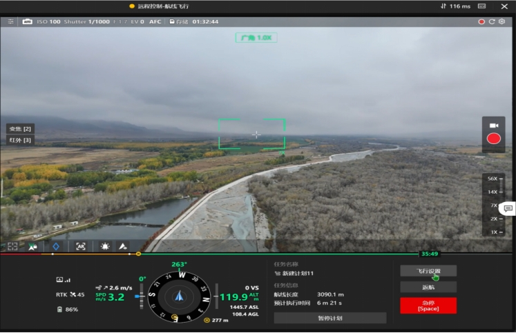 巡飞过程中,工作人员通过手机端或电脑端远程控制无人机对上下游河道进行全方位巡查,巡河画面实时传输至后台控制屏幕,实现足不出户开展巡河。