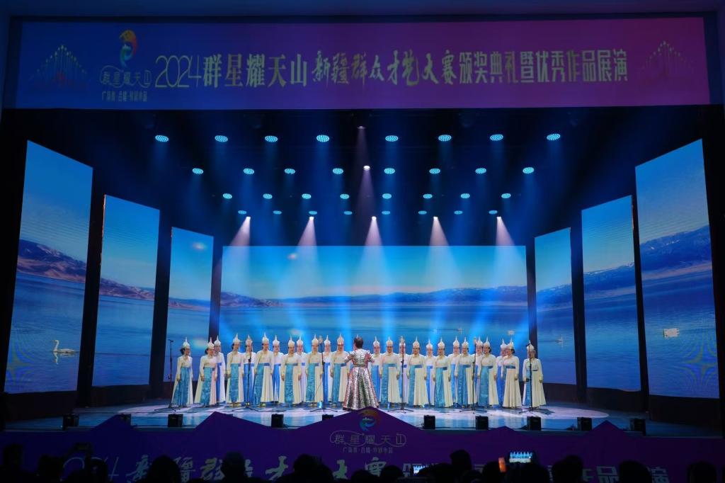 2024年新疆“群星耀天山”群众才艺大赛中博州文化馆奔布尔江无伴奏合唱团演出作品《请到赛里木草原来》与《天耀中华》,荣获合唱类创新作品奖。