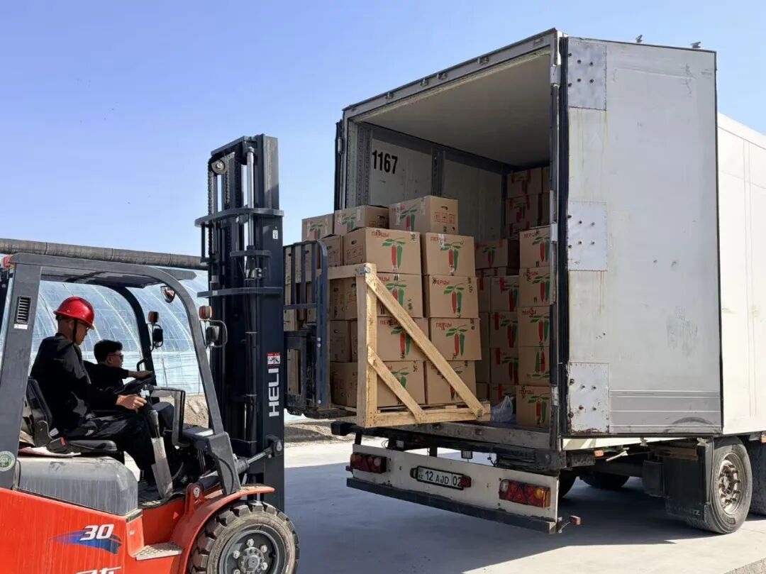 装车现场,工人们有条不紊地进行分拣、装箱、装车作业,新鲜采摘的辣椒经过严格筛选后,被妥善装入冷链运输车辆,全程锁鲜保鲜,最大程度保留蔬菜的鲜嫩口感和营养成分。“我们今天出口的蔬菜通过阿拉山口口岸出口哈萨克斯坦,出口的蔬菜主要有五彩椒、红椒等品种,共计44吨。”寿光农控集团博乐项目负责人张华友介绍,“目前我们园区已经完成GAP和HACCP国际认证以及相关农业体系认证,全流程对标国际生鲜出口标准,产品可以直接进入海外市场。”