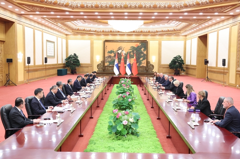 9月4日下午,国家主席习近平在北京人民大会堂会见来华出席纪念中国人民抗日战争暨世界反法西斯战争胜利80周年活动的塞尔维亚总统武契奇。新华社记者 丁林 摄