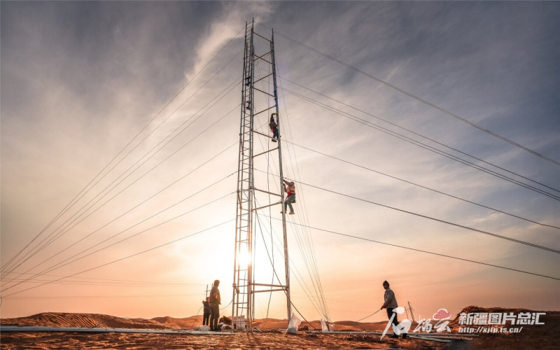 1月14日,工人在位于塔克拉玛干沙漠腹地的塔中1号公路旁架设通讯信号塔。建成后,通讯信号将覆盖塔中1号公路全线,服务油田职工和游客。汪宣斌摄