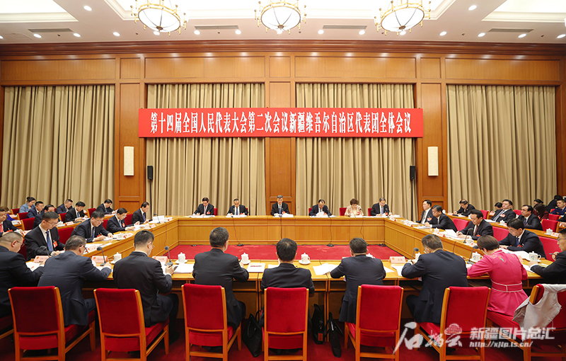 3月5日,参加十四届全国人大二次会议的新疆代表团举行全体会议,审议政府工作报告。石榴云/新疆日报记者 崔志坚摄