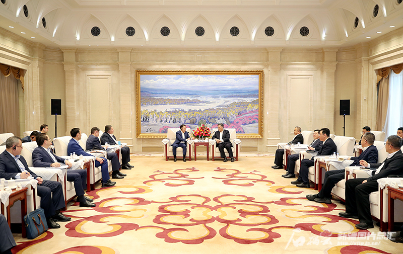 3月22日,自治区党委书记马兴瑞、自治区主席艾尔肯·吐尼亚孜在乌鲁木齐会见哈萨克斯坦交通部部长卡拉巴耶夫一行。石榴云/新疆日报记者 崔志坚摄