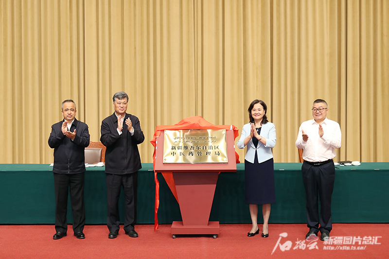 5月15日,自治区党委书记马兴瑞,自治区党委副书记、自治区主席艾尔肯·吐尼亚孜,国家卫生健康委党组成员、国家中医药管理局党组书记、局长余艳红等为新疆维吾尔自治区中医药管理局揭牌。石榴云/新疆日报记者 崔志坚摄