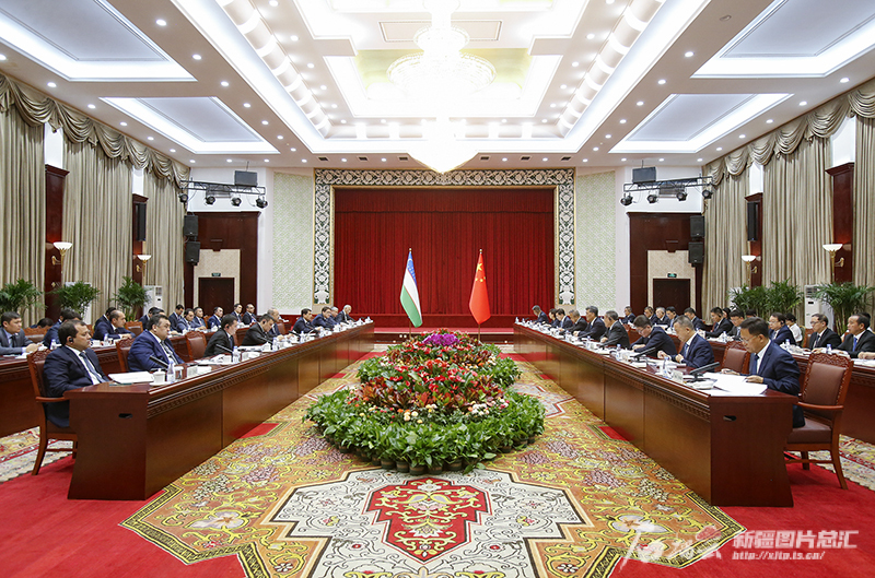 6月25日,自治区党委书记马兴瑞、自治区主席艾尔肯·吐尼亚孜,在乌鲁木齐市会见来新疆出席第八届中国—亚欧博览会的乌兹别克斯坦总理阿里波夫一行。 石榴云/新疆日报记者 谢龙 摄