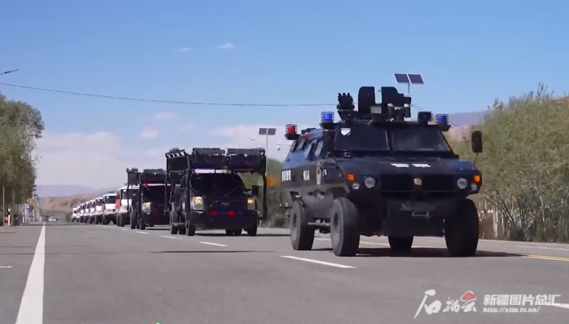武装拉动演训在南疆某地举行。新疆军区、武警、边检、公安、新疆生产建设兵团民兵等各方力量组成共3000人的演训队伍,出动直升机、无人机和装甲车、突击车等各类车辆,机动集结,严阵以待。