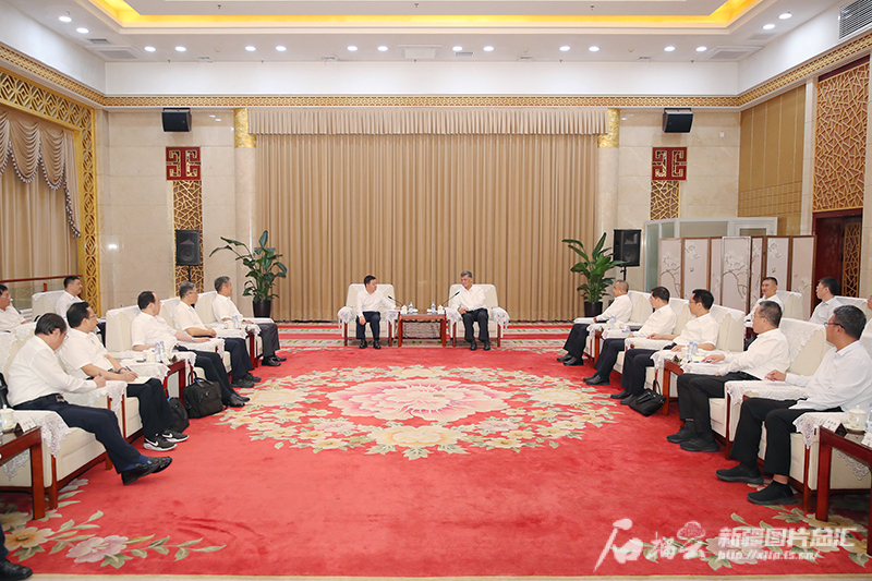 8月18日至20日,江西省委副书记、省长叶建春率江西省代表团来新疆考察对接对口支援工作。这是8月18日,自治区党委书记马兴瑞,自治区党委副书记、自治区主席艾尔肯·吐尼亚孜在乌鲁木齐会见代表团一行。石榴云/新疆日报记者 崔志坚摄