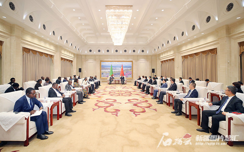 9月1日,自治区党委书记马兴瑞、自治区主席艾尔肯·吐尼亚孜在乌鲁木齐会见来新疆访问的赞比亚总统希奇莱马一行。石榴云/新疆日报记者 崔志坚摄