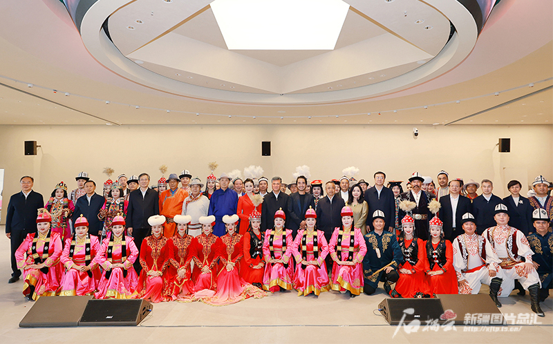 9月18日,新世界新疆非物质文化遗产馆顺利竣工并正式移交新疆。这是移交仪式结束后,自治区党委书记马兴瑞,自治区党委副书记、自治区主席艾尔肯·吐尼亚孜及有关嘉宾与新疆特色非遗项目展演人员合影。石榴云/新疆日报记者 崔志坚摄
