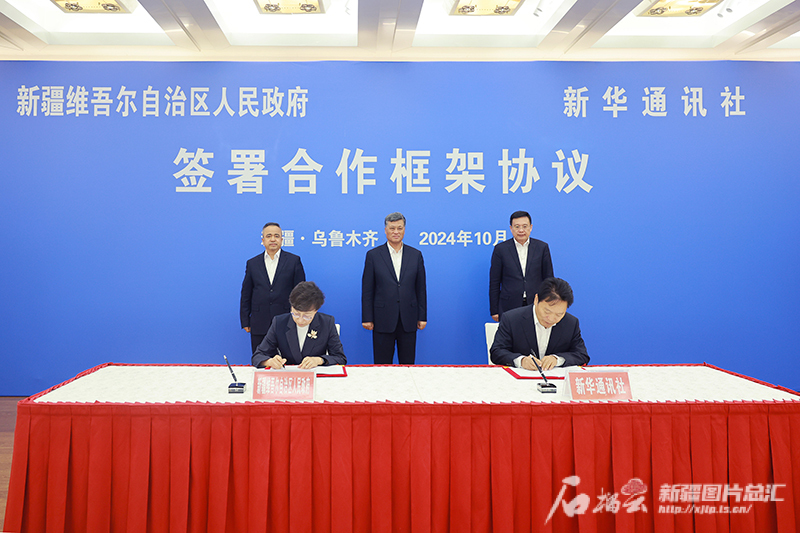 会见前,在自治区党委书记马兴瑞、新华社社长傅华、自治区主席艾尔肯·吐尼亚孜见证下,自治区人民政府和新华社签署合作框架协议。石榴云/新疆日报记者 崔志坚摄