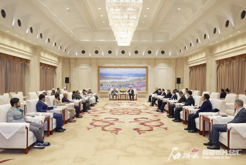 12月4日,自治区党委书记马兴瑞、自治区主席艾尔肯·吐尼亚孜在乌鲁木齐会见来访新疆的孟加拉国伊斯兰政党联合代表团。石榴云/新疆日报记者 崔志坚摄