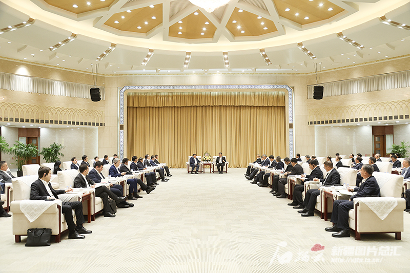 12月13日,自治区党委书记马兴瑞、自治区主席艾尔肯·吐尼亚孜在乌鲁木齐会见乌兹别克斯坦投资、工业和贸易部副部长卡西莫夫率领的政府部门代表团一行。石榴云/新疆日报记者 谢龙摄