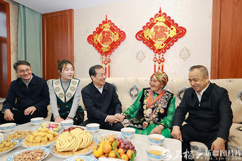 2月14日,自治区党委书记陈小江、自治区主席艾尔肯·吐尼亚孜在阿图什市中心敬老院,为各族老年人送上新春祝福。天山网-新疆日报记者 崔志坚 摄