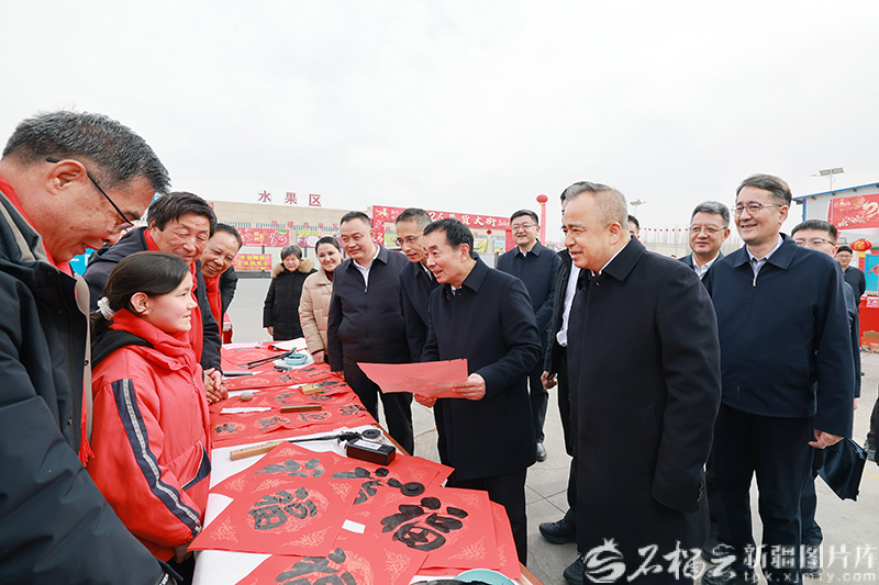 疏附县疆南农副产品批发市场里正举办年货大集,各类特色商品琳琅满目,写春联、送福字活动备受欢迎,现场洋溢着浓浓的年味儿。陈小江、艾尔肯·吐尼亚孜饶有兴致地察看年货摊位,了解蔬菜等农副产品供应情况。陈小江叮嘱有关负责同志,加强货源组织和产销对接,丰富节日市场供给,全力保障民生商品供应充足、价格稳定、质量放心。