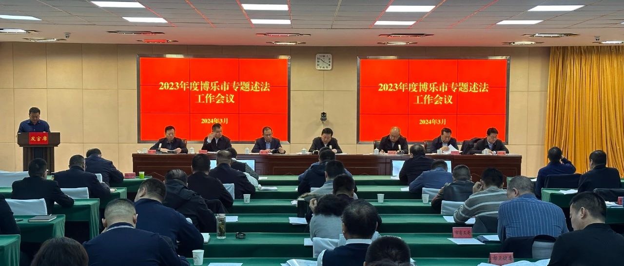 3月8日,博乐市召开2023年度专题述法工作会议,深入学习贯彻党的二十大精神,贯彻落实习近平法治思想和习近平总书记关于新疆工作的重要讲话重要指示批示精神,按照党中央关于依法治国、依法治疆的工作部署和自治区、自治州党委的工作要求,进一步压实党政主要负责同志履行推进法治建设第一责任人职责,总结成绩、查找问题、改进工作,推动依法治市工作高质量发展,为扎实推进博乐市经济社会高质量发展提供坚强的法治保障。博乐市委书记李海军主持会议并讲话。