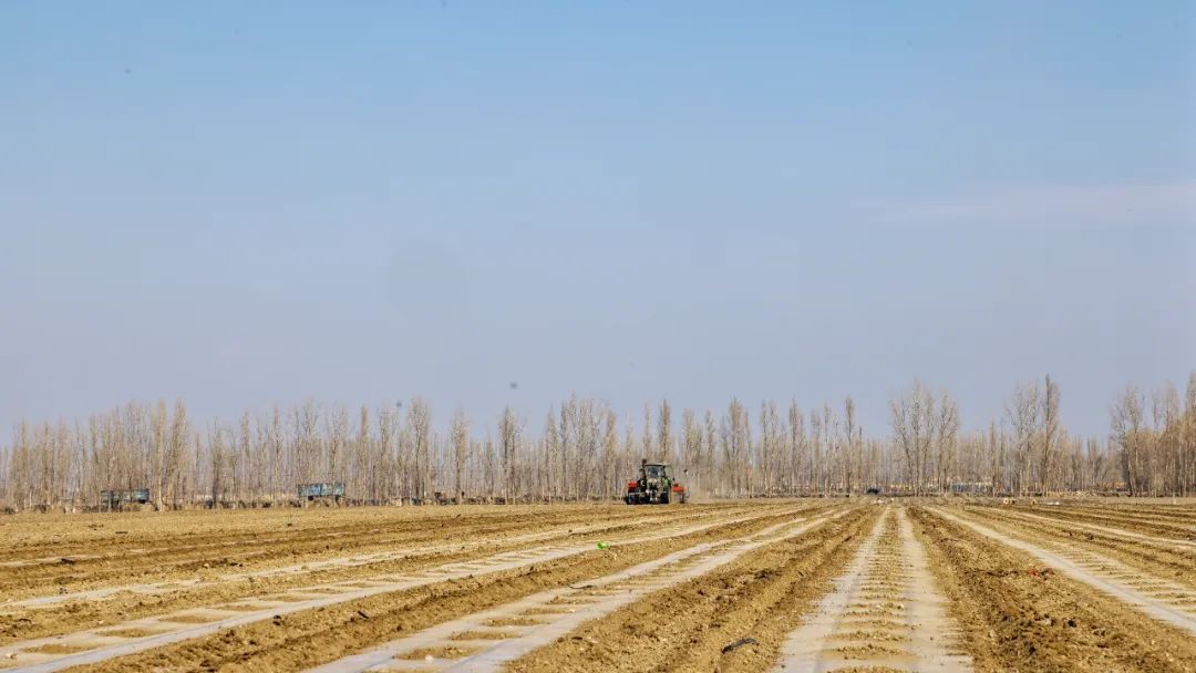 3月25日,在精河县阿合其农场农一队瓜农李贵中的地里,伴随着大马力的轰响声,一台装载着北斗导航的西瓜播种机正在田间来回穿梭。