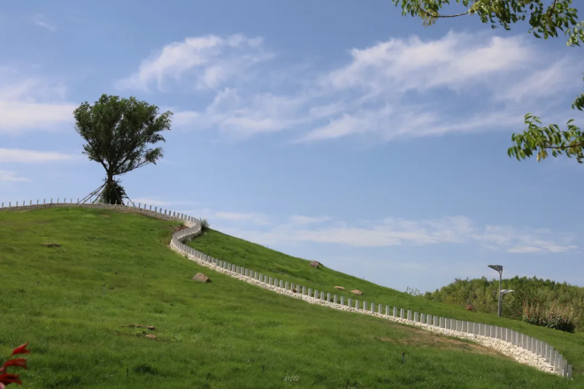 该区域原为戈壁丘陵荒地,地质以砾石为主,造林立地条件差,树木难以成长,后经专家论证,决定利用工程废方及建筑垃圾堆山造园,形成一个小型山丘,可登高望远。