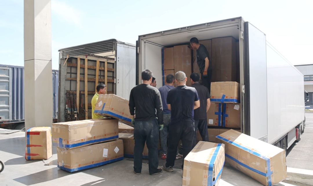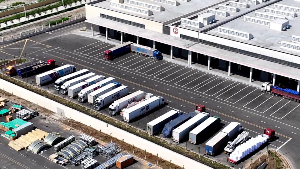 6月8日,在阿拉山口综合保税区跨境电子商务分拣清关中心,一辆辆满载货物的集卡车在各企业仓库装卸货物,工作人员正忙着装车,一派火热的繁忙景象。