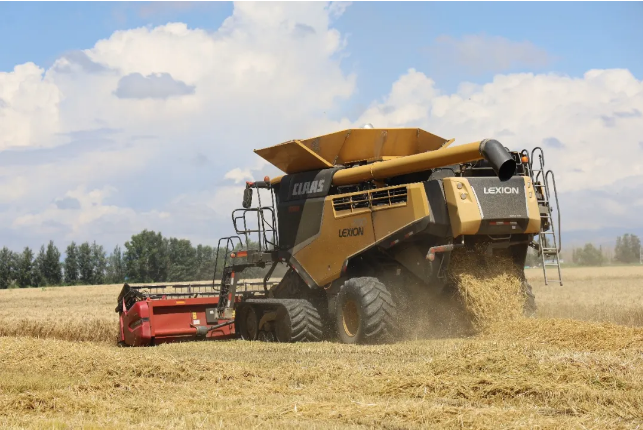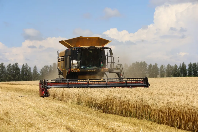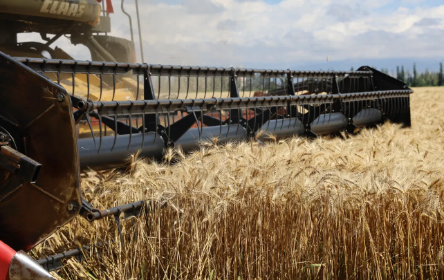 夏收时节,在博乐市小营盘镇哈日莫墩村的冬小麦高产攻关示范田内,大型收割机在田间来回穿梭,把一排排黄金的麦穗收入“囊”中,一派丰收景象。