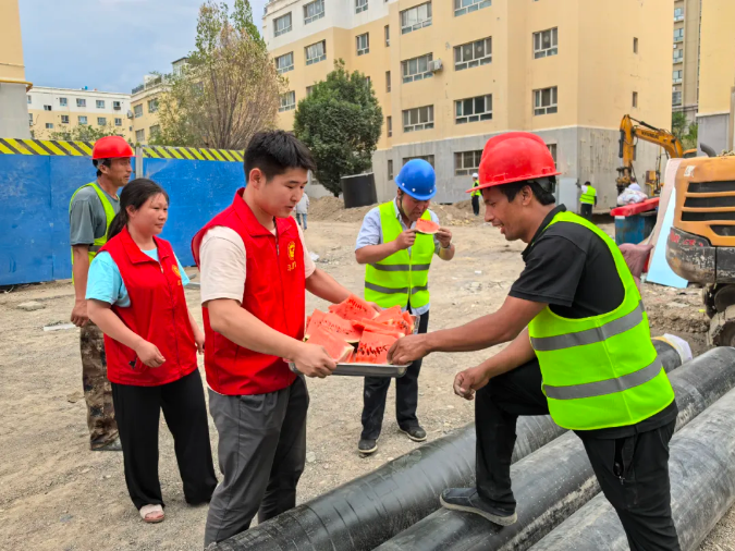 青得里街道和平社区为在高温下坚持的一线工作者送去了爱心礼包、西瓜、矿泉水等物品,为他们送去了丝丝清凉。