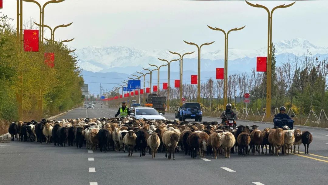 由于转场牲畜数量多、距离长、速度慢,容易引发交通拥堵和安全事故。精河县公安局交警大队民辅警在转场前详细了解牧民转场时间与路线,对沿途路段进行勘查标注,提醒牧民做好安全防护。转场期间,加强指挥疏导,提醒过往驾驶员注意避让转场牲畜和牧民。精河县公安局交警大队交警热那提表示:“秋收后是牧民转场高峰期,我们要帮助牧民把牛羊安全送到目的地,确保道路安全顺利通行。”