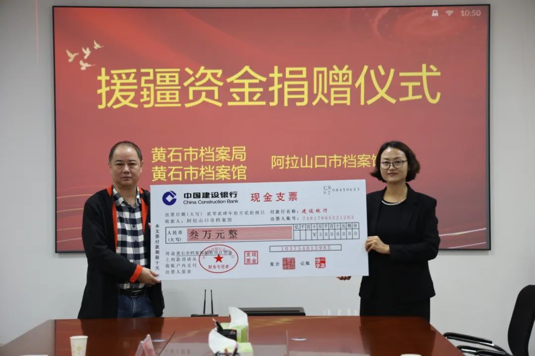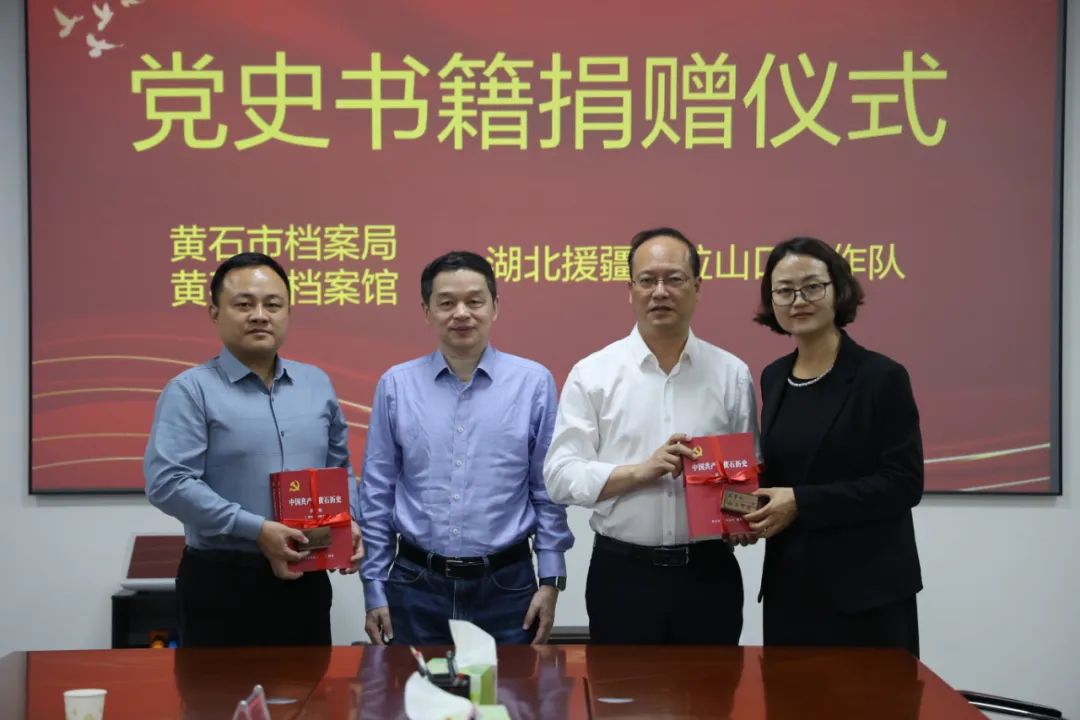座谈会上,黄石市档案馆向湖北援疆阿拉山口工作队赠送党史书籍和学习U盘,并举行了资金捐赠仪式。黄石市档案馆还与阿拉山口市档案馆签订了援助协议及档案异地备份协议。