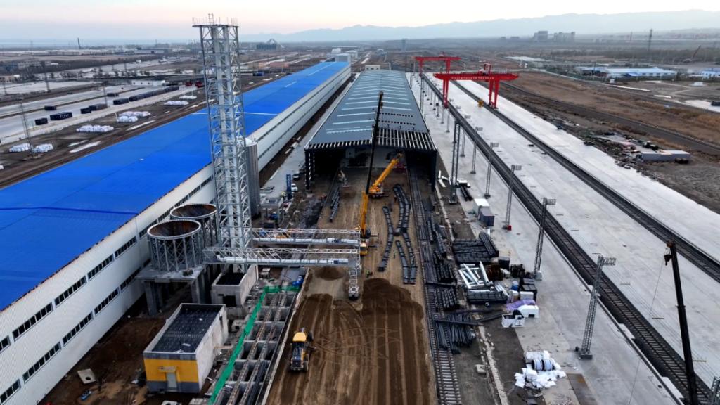 11月15日,阿拉山口口岸铁路站区钾肥换装线建设项目施工现场一派繁忙景象,挖掘机、起重机等大型机械设备交互作业,轰鸣声不绝于耳,施工人员正忙着进行换装库主体钢结构吊装作业。据了解,该项目总投资2.3亿元,占地约100亩,新建钾肥铁路换装线2条,铺轨2.01公里,新建2万平方米钾肥换装库1座,设1000吨钾肥中转筒仓4座。