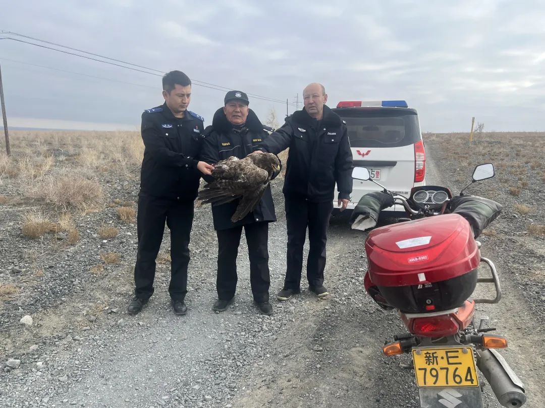 “警察同志,有一只老鹰在托托镇红山嘴南边戈壁滩上,疑似受伤,无法飞行。”11月16日上午12时许,精河县托托镇派出所接到群众贾冰峰报警称发现一只野生动物需要救助。