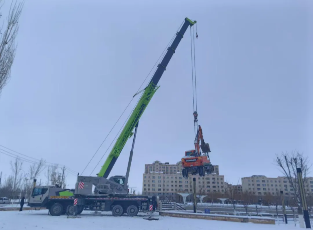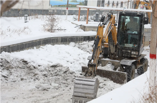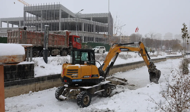 12月16日,在博乐市青得里河、星火干渠施工现场,远处吊车伸展长臂,近处挖掘机挥舞长臂,现场机械轰鸣,施工车辆川流不息,工人们正在进行河道清理、石料运输等作业。