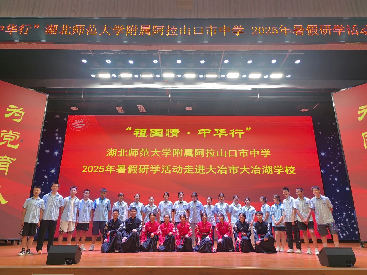 另一侧的报告厅内,两地学生正上演“文化互荐”:阿拉山口学子用生动讲述与多彩表演展现家乡风情,大冶学子则以大气磅礴的国风大鼓回应。当《爱我中华》的音乐响起,学生们自发手拉手围成圆圈起舞,青春的活力与民族的情谊在舞步中交融,台下掌声如潮。