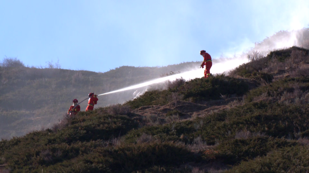 11时10分,随着总指挥一声令下,应急实战演练正式开始。应急分队按照集结命令第一时间赶赴现场,迅速展开行动,利用风力灭火机、油锯等装备压制火势、清除可燃物;随后,半专业扑火队伍、巴音阿门村村民消防队陆续支援,采用“以水灭火”战术,通过水车运送水源,布设消防水带、水囊,开辟隔离带阻止飞火扩散,快速、安全、有序地完成灭火操作。灭火后,各队伍对烟点、残火进行清理,有效防范火情复燃。