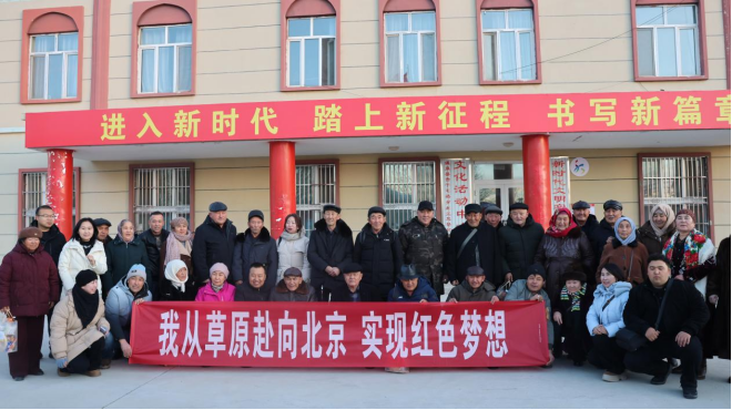 出发前,全体人员移步村委会大楼前合影留念。鲜红的“我从草原赴北京 实现红色梦想”横幅在阳光下格外醒目,老人们挺直腰板站在横幅前,脸上洋溢着幸福的笑容,身后“进入新时代 踏上新征程 书写新篇章”的标语,更是为这场圆梦之旅增添了别样的时代意义。镜头定格的瞬间,草原儿女对祖国的热爱与对红色梦想的向往,都凝聚在这张合影里。