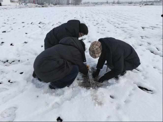 温泉县定期组织农技人员深入田间,开展冬小麦雪层监测,实行“一对一”技术指导,他们不仅手把手向种植户传授冬小麦越冬管护技巧,普及病虫害防治知识,引导农户做好风险应对。重点推广水肥一体化、雪墒施肥施药等先进技术,提升田间管理科学化水平。同时加密雪情、苗情巡查频次,密切监测冻害风险,及时排查化解隐患,把技术服务送到农户家门口。