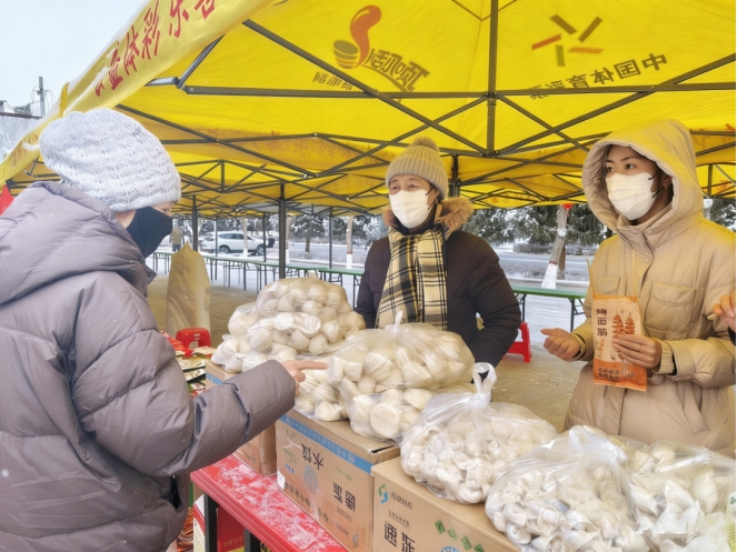 活动现场暖意融融、热闹非凡,以“非遗+年货”模式构建沉浸式消费场景,汇聚了温泉县本地各类非遗商品与特色年货,一站式满足群众新春采购与文化体验需求。在非遗展区,手工刺绣、布艺拖鞋、艾草枕等传统手工艺品做工精湛,图案巧妙融合传统纹样与马年新春元素,针脚间尽显匠心,吸引了众多群众驻足欣赏、咨询选购;美食区则集结了县域优质农牧特色产品,赛湖渔业冷水鱼、安格里格镇西域哈伦水饺、昆得仑牧场木呼尔队鲜驴奶、温泉县贝勒旗尔奶制品等地道美味新鲜供应,让大家在逛展之余,品尝到原汁原味的草原风味。此外,各类冷链产品、休闲零食、新春礼盒一应俱全,全方位覆盖群众采购需求,让浓郁年味在烟火气中愈发醇厚。