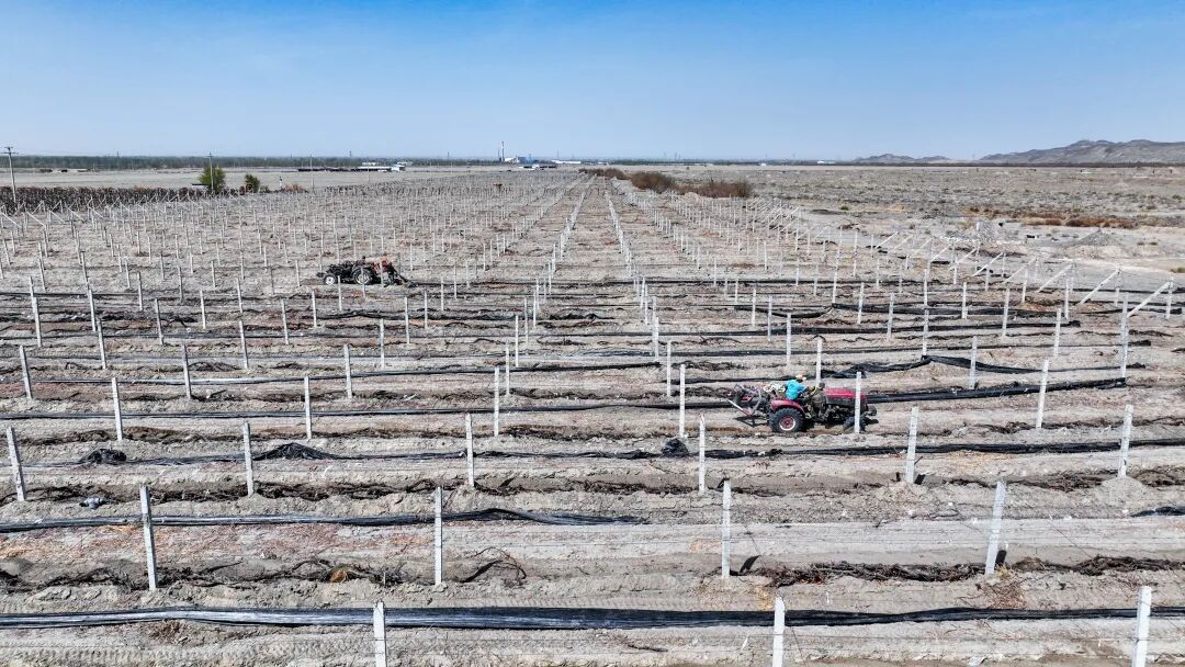 4月8日,在位于茫丁乡北地东村的精河县精葡酒业有限公司千亩葡萄园里,专业开墩机械来回穿梭,轰鸣作业,迅速清除葡萄藤上的越冬覆土;工人们紧随其后,将苏醒的藤蔓细心整理、绑缚上架,田间一派繁忙景象。