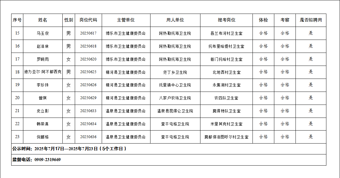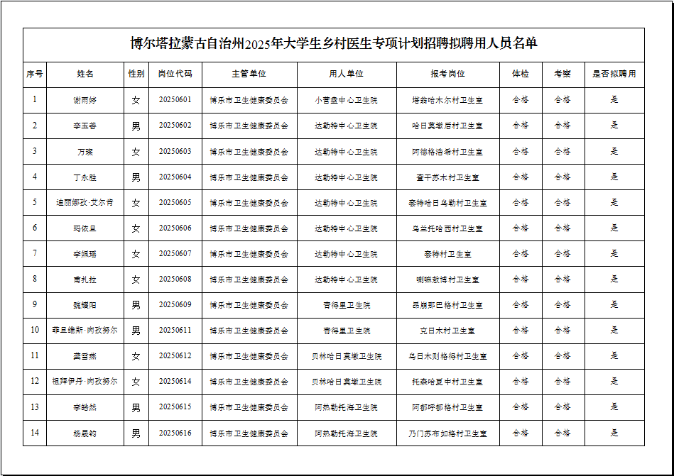 博尔塔拉蒙古自治州2025年大学生乡村医生专项计划招聘拟聘用人员名单公示