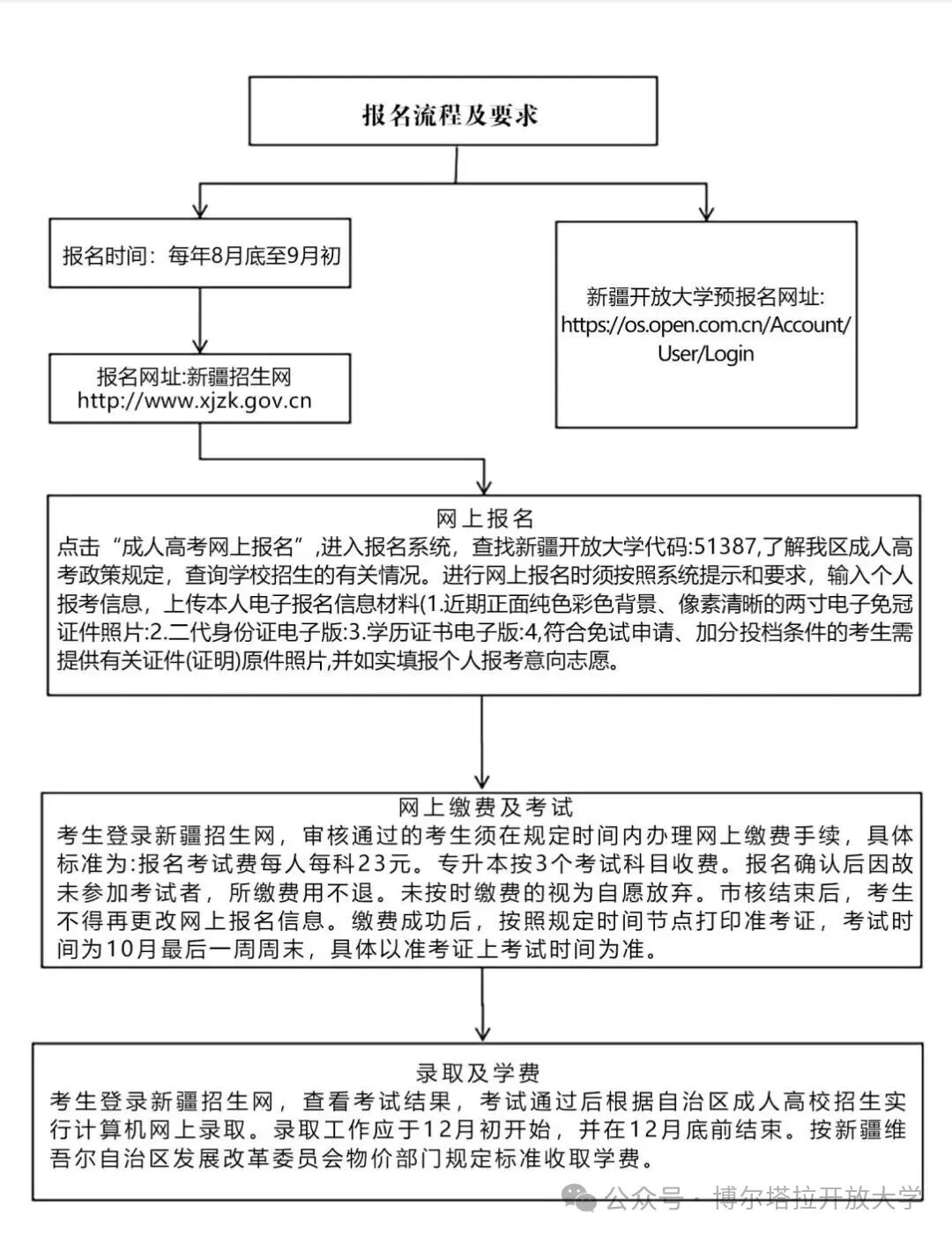 考生需在新疆维吾尔自治区公布的成人高校招生考试时间参加考试,达到最低录取分数线,学校根据上线考生的成人高考成绩,择优录取。