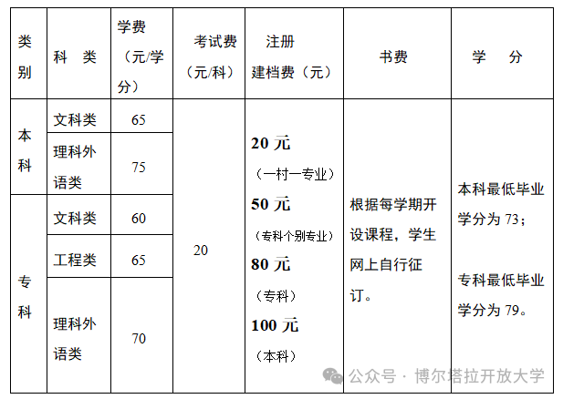开放教育各专业学费、考试费、注册建档费等费用一览表