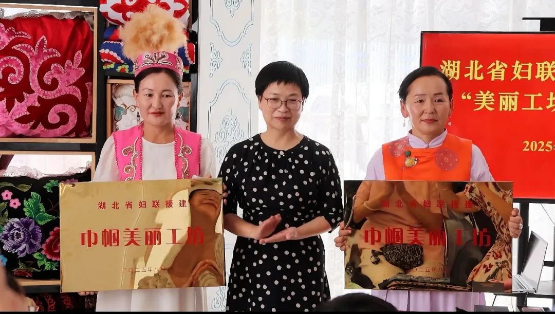 肖红梅向思美尔合作社授予“巾帼美丽工坊”牌匾,捐赠价值5万元刺绣材料包,肖红梅指出:“湖北将依托‘姐妹共建·幸福家园’平台,在技术培训、设计升级、电商销售等方面提供支持,助力博州手工艺品牌走向全国。”