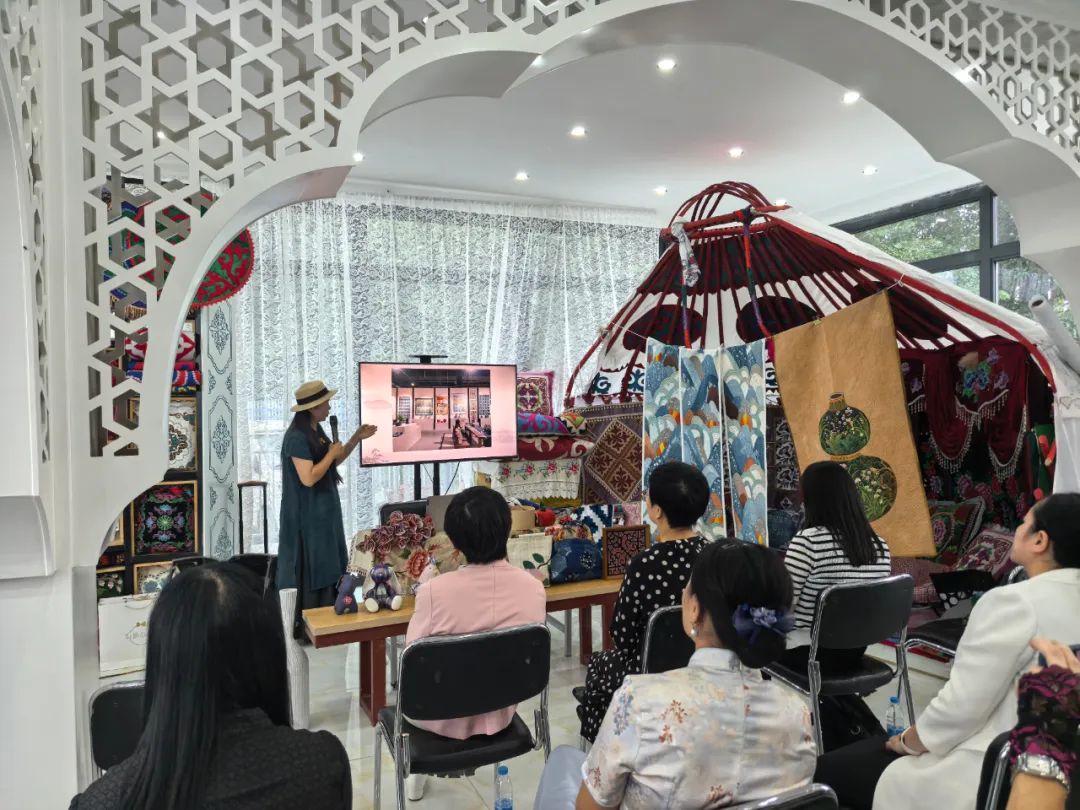 交流环节中,恩施州妇联主席刘俐萍通过PPT展示了国家级非遗“西兰卡普”的织造技艺,其几何纹样与新疆刺绣的写实风格形成鲜明对比;黄石非物质文化遗产代表性传承人殷海霞演示的“剪云拼布绣”,将剪纸与刺绣结合,分享了年销200万元文创产品及短视频提升客单价30%的电商经验。互动中,针对“手工效率与市场需求平衡”“电商包装设计”等问题,两地达成合作意向。