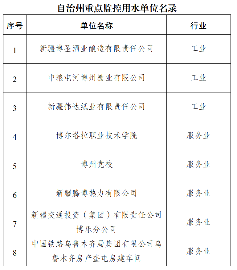 为贯彻落实国家节水行动,根据《关于加强重点监控用水单位监督管理工作的通知》(新水办〔2024〕262号)、《关于更新完善州、县级重点监控用水单位名录工作的通知》(博州水利函〔2024〕127号)要求,结合各单位实际用水情况,确定新疆博圣酒业酿造有限责任公司等8个单位纳入重点监控用水单位名录(附件1),现将名录予以公布,并将相关要求通知如下: