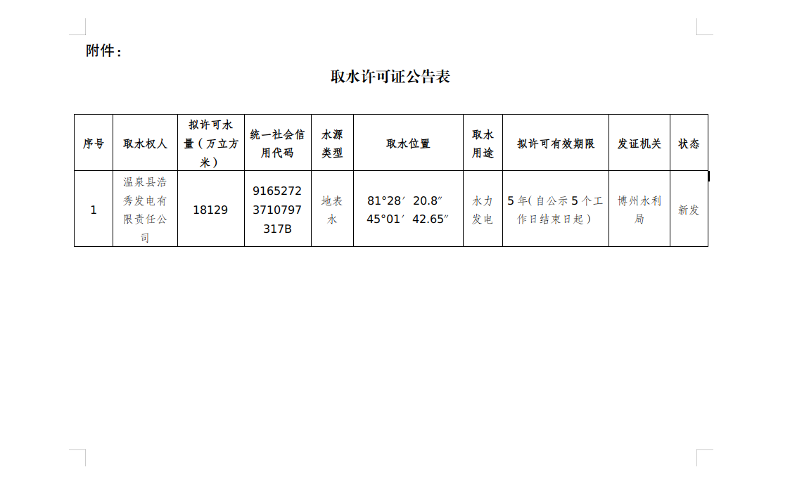 温泉县浩秀发电有限责任公司于2024年11月19日向自治州水利局提交了《项目取水工程(设施)验收申请表》等材料,经研究,拟同意办理取水许可。根据《取水许可和水资源费征收管理条例》《新疆维吾尔自治区取水许可管理办法》等相关规定,现对该项目取水许可进行公告(附件)。若对取水许可有异议的,可在公告之日起五日内以书面形式向自治州水利局提出意见。