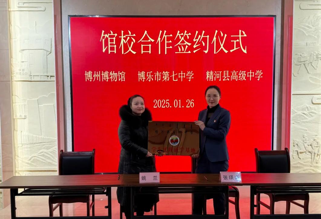 为贯彻落实习近平总书记关于文物保护的重要指示精神,进一步铸牢中华民族共同体意识,充分发挥博物馆的社会教育职能,促进博物馆资源与学校教学、综合实践有机结合,实现馆校合作的双向赋能。2025年1月26日上午,博州博物馆与博乐市第七中学、精河县高级中学在博州博物馆举行馆校合作签约仪式,正式开启双方在教育领域的深度合作,携手共筑教育发展新篇章。