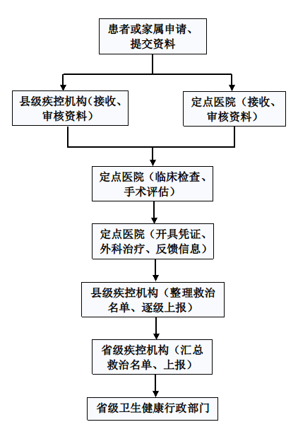 (一)在人群筛查或者在流行地区的医疗机构就诊发现并确诊的患者,疾控机构或医疗机构告知患者或者家属向当地县级疾控机构提交外科救治申请表、交验患者身份证原件并提供复印件、患者近期照片。在定点医院就诊的患者,患者或者家属向该定点医院提交申请表和相应资料。