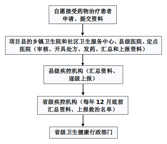 第九条 项目县的乡镇卫生院和社区卫生服务中心、县级医院、定点医院,开展患者药物治疗。