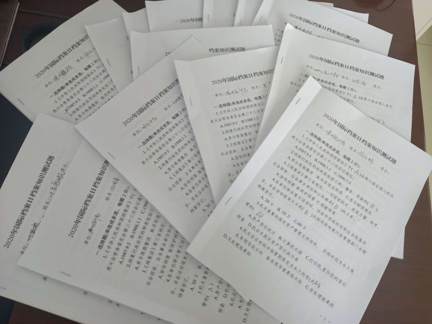 通过测试,大家了解到档案与我们每一个人息息相关,了解到档案的查阅流程、档案收集整理的基本方法以及档案服务民生的重要意义。测试题选自档案系统的法律法规、技术标准等,以档案法律法规为主,基础业务知识为辅,采取现场集中答题的方式进行理论测试,并在测试结束后对所有试卷进行了评分。