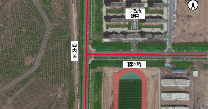 博乐市精河路-西环路路口,现状为“T”字路口,精河路道路双向六车道,两侧有非机动车道;西环路道路双向四车道,无非机动车道,两侧有人行步砖,路中无隔离护栏;精河路沿线路侧分布有小区和少量商铺。