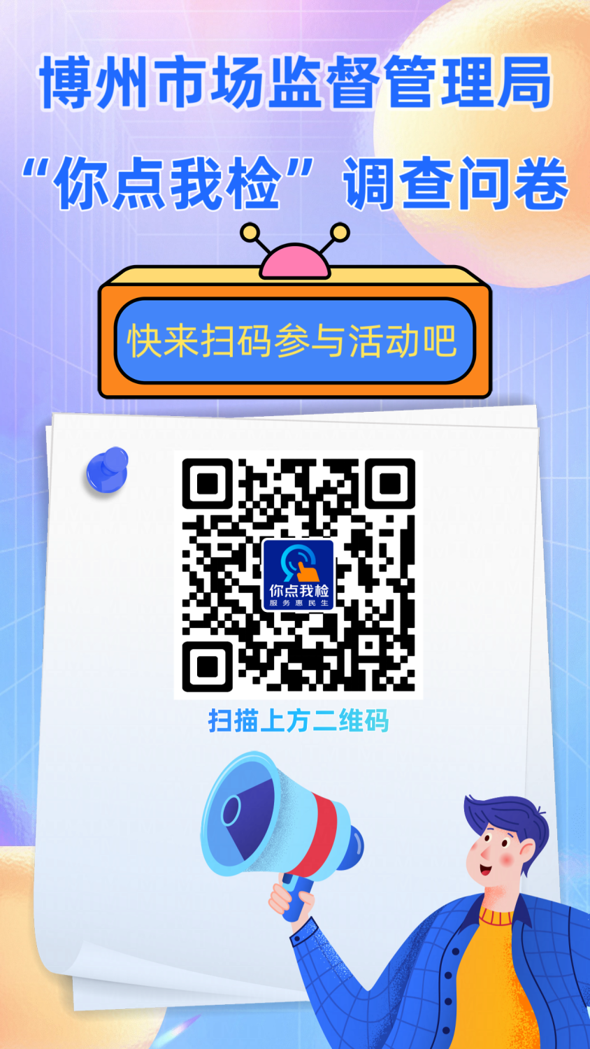为进一步筑牢食品安全防线,发挥社会公众在食品安全中的参与和监督作用,博州市场监管局邀请您参加食品安全“你点我检”问卷调查活动,选出您最关心的食品种类、抽检场所和检验项目!我们将对问卷结果每类食品排名靠前的品种,安排权威检验机构,在群众投票集中的场所进行抽样,并在博州市场监督管理局官方网站公布抽检结果。快发动家人朋友一起参与吧!
